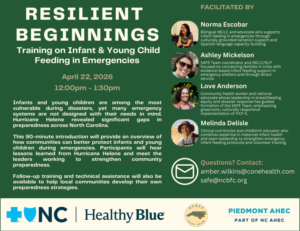 The series will launch on Wednesday, April 22, 2026, with a 90-minute virtual Lunch & Learn hosted through Piedmont AHEC. The session will convene health advocates and community responders from across the state to explore practical, evidence-based strategies for protecting infant feeding during emergencies. Continuing education credit will be available.