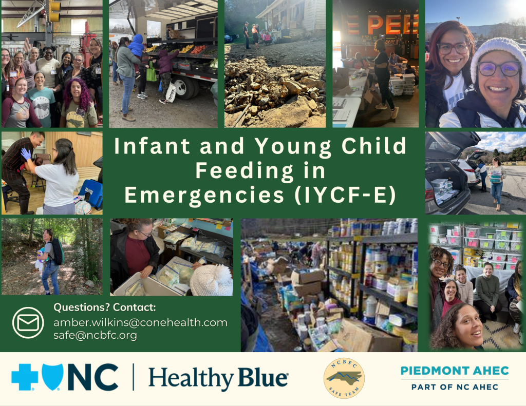Raleigh, NC — The North Carolina Breastfeeding Coalition, in collaboration with the SAFE Infant Feeding Team, Breastfeeding Family Friendly Communities and Healthy Blue, Blue Cross and Blue Shield of North Carolina’s Medicaid Managed Care plan, is launching a new statewide training series focused on Infant and Young Child Feeding in Emergencies (IYCF-E) for North Carolina health advocates, community responders, and perinatal support professionals.