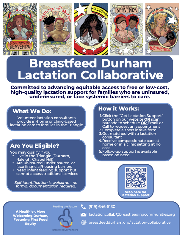 The Breastfeed Durham Lactation Collaborative provides free and low-cost lactation care for uninsured and underinsured families. Our goal is to scale this model across counties—beginning with Western NC—to make equitable lactation support accessible statewide.